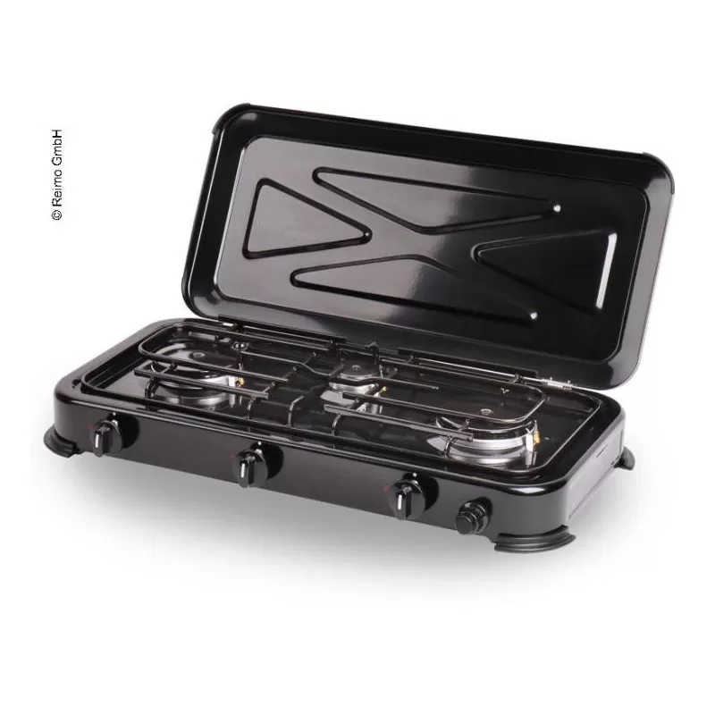 Le Mary 3 de CAMP4 est un réchaud gaz à 3 feux avec couvercle et allumage piezo pour l’équipement du fourgon aménagé, camping-car et la cuisine de camping.