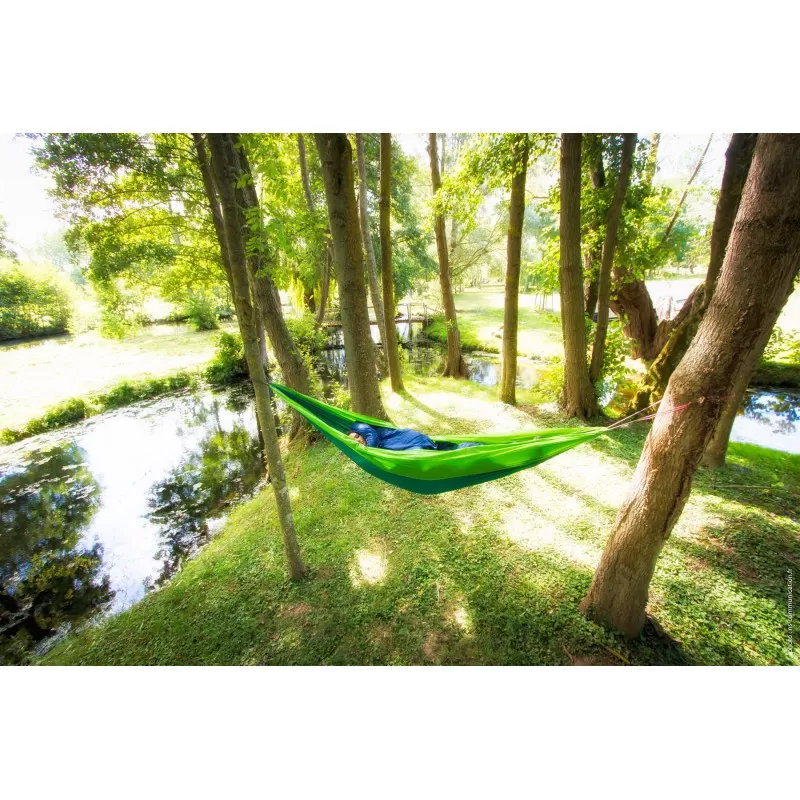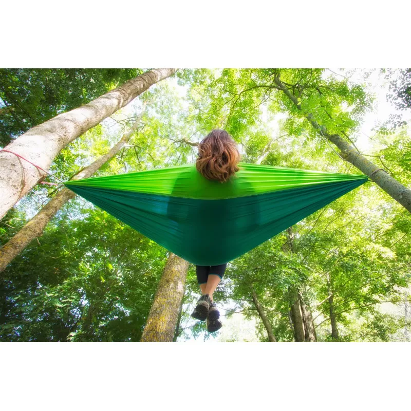 Hamac en toile de type parachute CAO OUTDOOR disponible en bleu ou en vert idéal pour le camping ou randonnée et le plein air en camping-car et bateau !