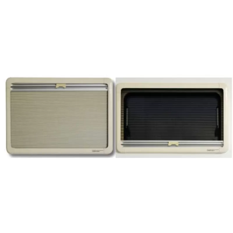 Cadre de finition, d’habillage intérieur pour les baies et fenêtres latérales de fourgons aménagés et camping-car CARBEST RW Compact ; avec moustiquaire et store occultant plissé.