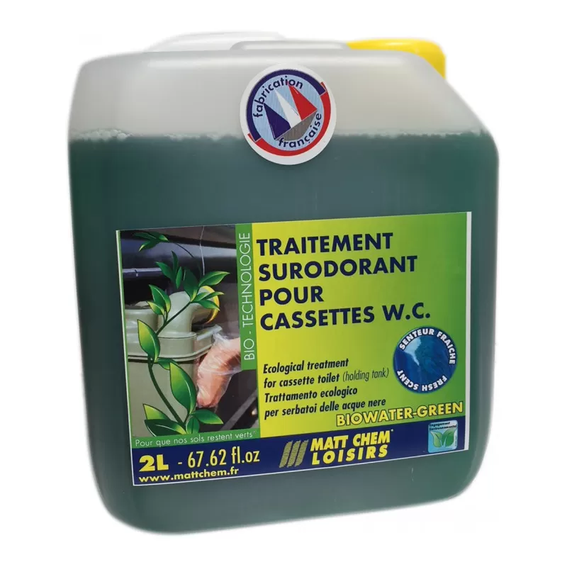 Le MATT CHEM Biowater Green est un produit pour WC chimique ultra-efficace pour la liquéfaction des matières fécales et de la cellulose (papier toilette) dans la cassette. Bio-efficace grâce à ses enzymes, le Biowater Green est sur-odorant dégageant donc une odeur fraîche laissant une impression de propreté. Respectueux de la santé des utilisateurs, le PH est pratiquement neutre et le produit est non caustique.