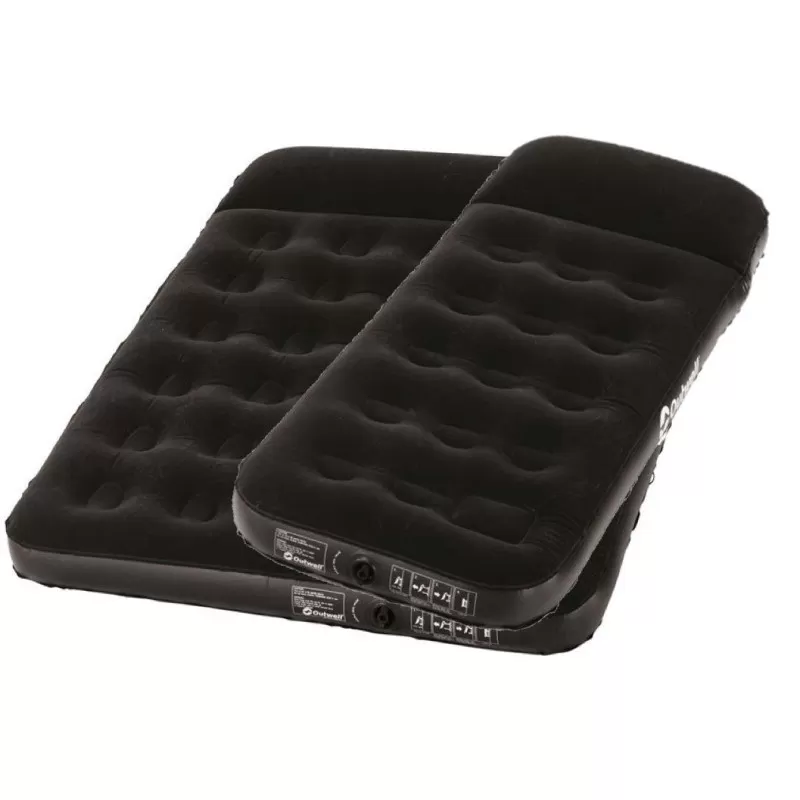 Matelas gonflable classique en PVC et revêtement velours de chez OUTWELL très épais avec oreiller et pompe de gonflage pour passer de douces nuits en camping ou pour un lit d’appoint rapide à installer à la maison.