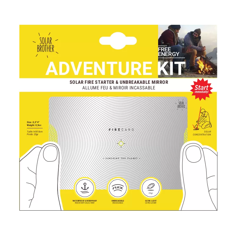 L’Adventure Kit de chez SOLAR BROTHER est un allume-feu solaire combiné à un miroir vous permettant ainsi de démarrer un feu de camp ou un barbecue rapidement sans autre énergie que le soleil ! Compact, il est incontournable pour la randonnée ou vos voyages en van aménagé.